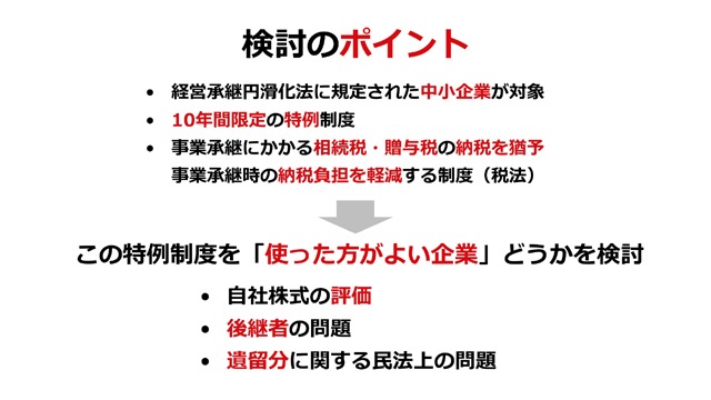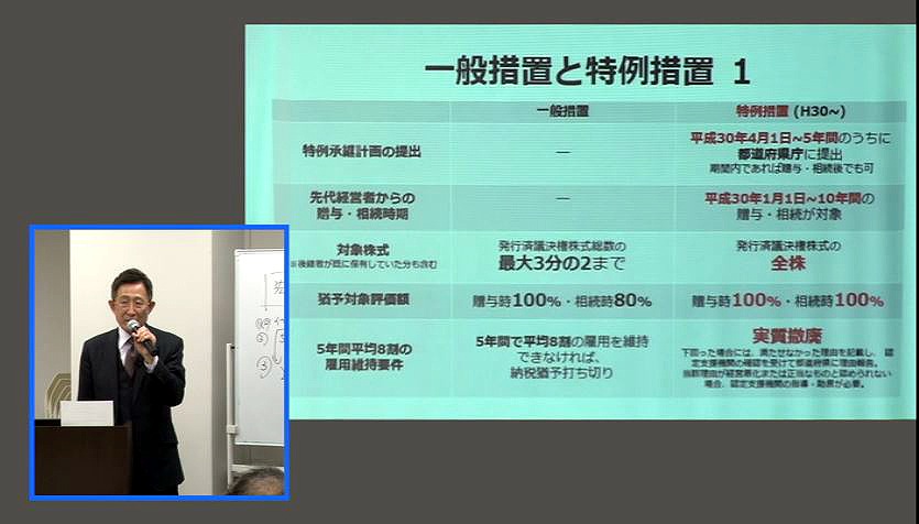 特例事業承継税制は、「お得でバラ色」ととらえられている方も多いのですが、実は落とし穴もあるという辛口の話を加えて要点を絞ったお話をさせていただきました。